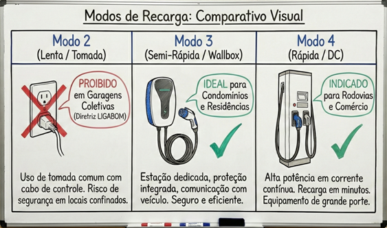 - Modo 1 e 2 (Lenta): Utilizam tomadas residenciais padrão. O Modo 1 não possui proteção no cabo, sendo obsoleto. O Modo 2 possui um dispositivo de proteção no cabo (IC-CPD). Importante: A nova diretriz LIGABOM proíbe o uso do Modo 2 em garagens e locais confinados.