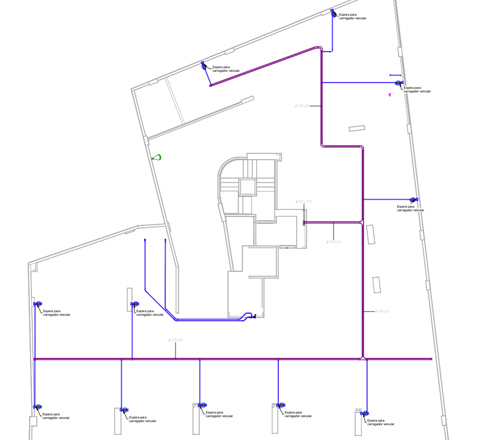 Seguindo as recomendações da NBR 17019, o projeto residencial contemplou circuitos exclusivos para os pontos de recarga. Na planta de distribuição das garagens, é possível visualizar o posicionamento estratégico dos pontos, prevendo a passagem de eletrodutos e cabos que atendam às vagas de forma organizada, sem improvisos.