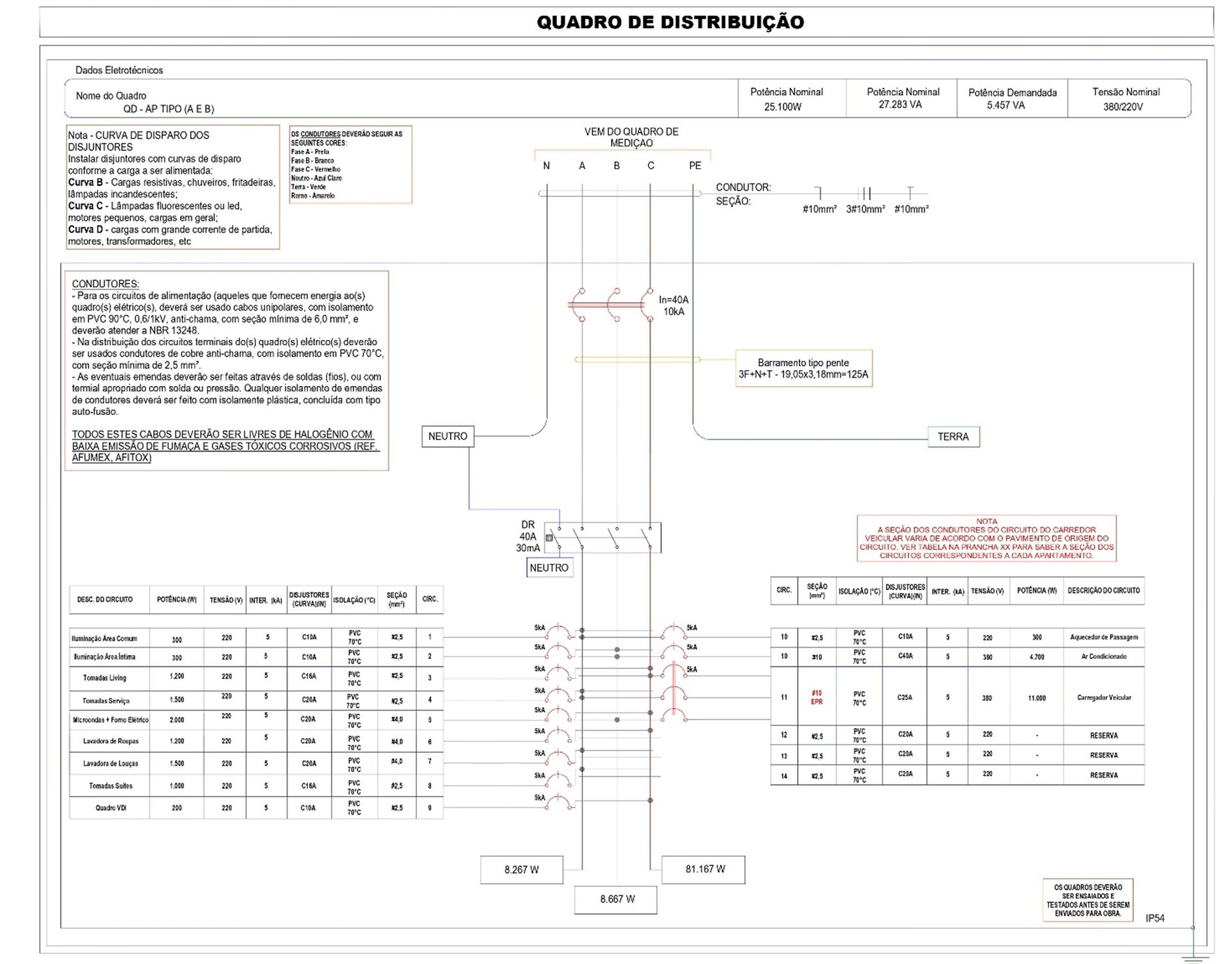 Legenda: Diagrama trifilar do Quadro de Apartamento tipo A/B, destacando a proteção por DR nos circuitos dedicados.