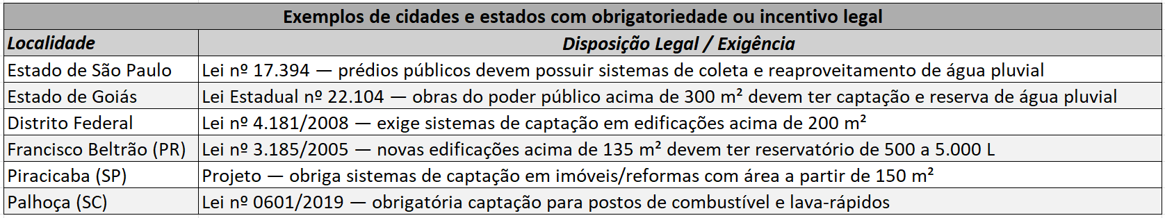 - Muitas cidades já exigem, por lei, sistemas de aproveitamento de água de chuva em novas edificações, como por exemplo: