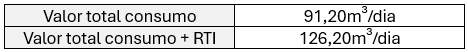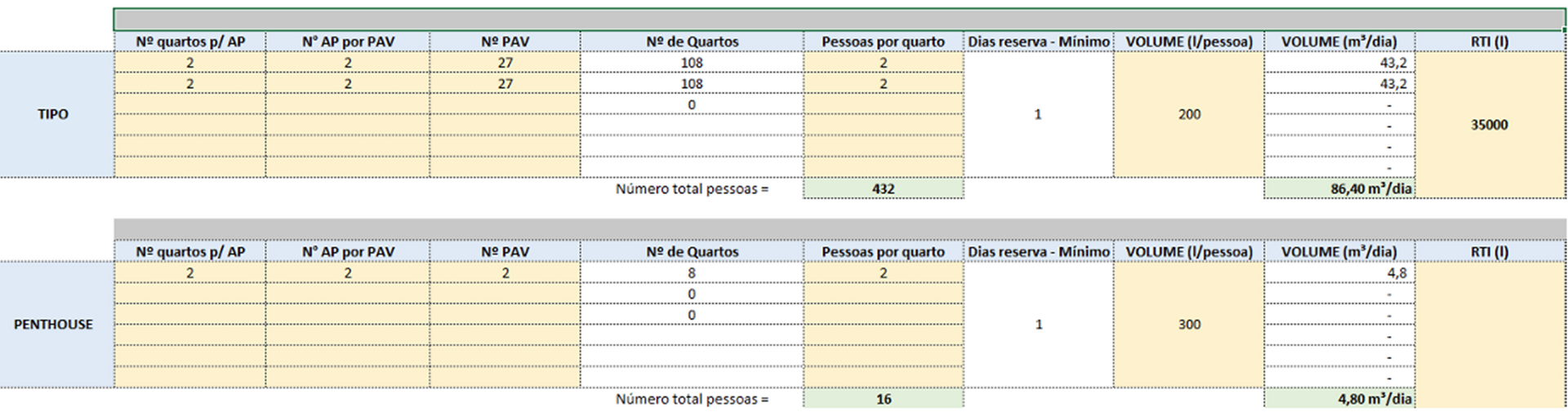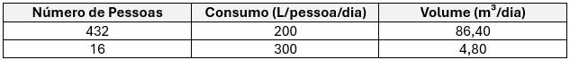 Como o empreendimento em questão é localizado em Goiânia-GO, de acordo com a legislação local (Resolução nº 305/2008 – CG), o consumo diário por pessoa pode variar conforme a área construída (em m²) das unidades habitacionais. Neste caso, levando em consideração as características da ocupação, considerou-se 200 L/pessoa/dia para as unidades que se enquadram na faixa de 101 até 200 m² de área construída, e 300 L/pessoa/dia para as unidades entre 201 até 300 m².