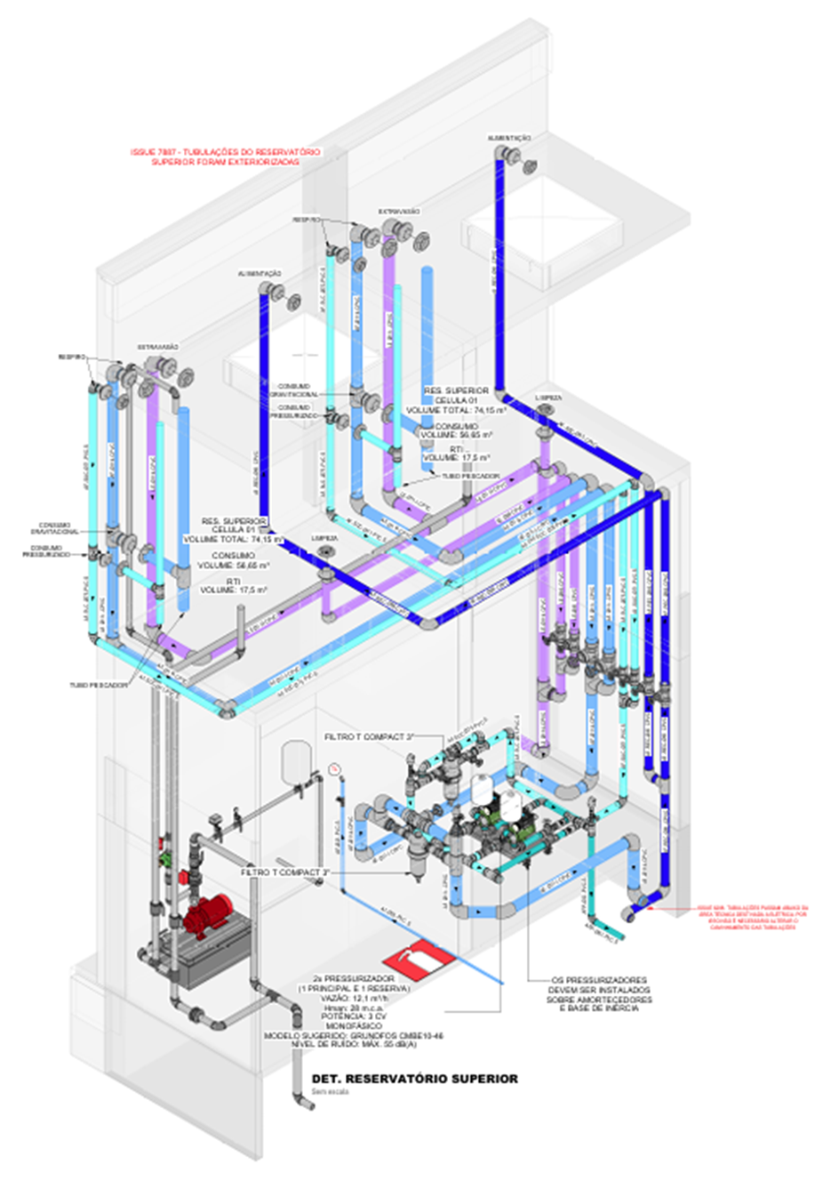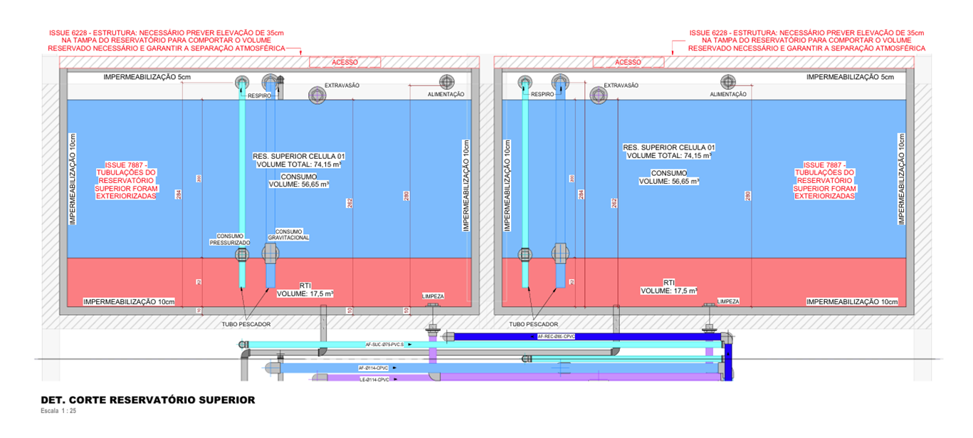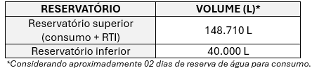 No presente empreendimento, embora a legislação municipal exigisse apenas a reserva mínima correspondente a 1 dia de consumo, a concepção arquitetônica e estrutural possibilitou a adoção de um volume para 1,7 dia. Essa escolha está em conformidade com a NBR 5626:2020, que estabelece como limite máximo 3 dias de reserva. Dessa forma, priorizando a segurança e o conforto dos moradores, o cliente optou por manter a reserva para, aproximadamente, dois dias de reserva.