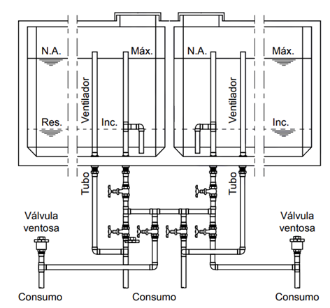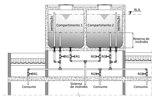 Em geral, as reservas técnicas de incêndio em edifícios são armazenadas nos mesmos reservatórios de água potável, porém com saídas de distribuição em cotas separadas de forma a assegurar que a RTI não seja consumida para outros fins (conforme ilustra a Figura 8).