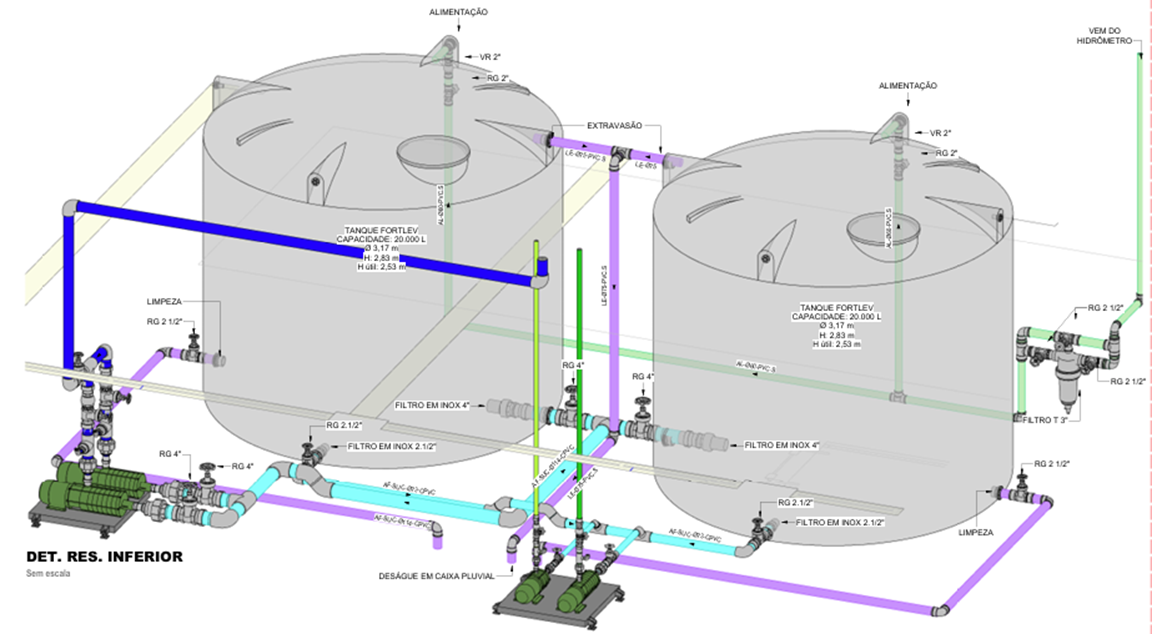 Considerando a RTI no reservatório superior, os espaços disponíveis no projeto, as medidas comerciais dos reservatórios, as considerações da legislação local e do cliente, chegou-se na seguinte distribuição: